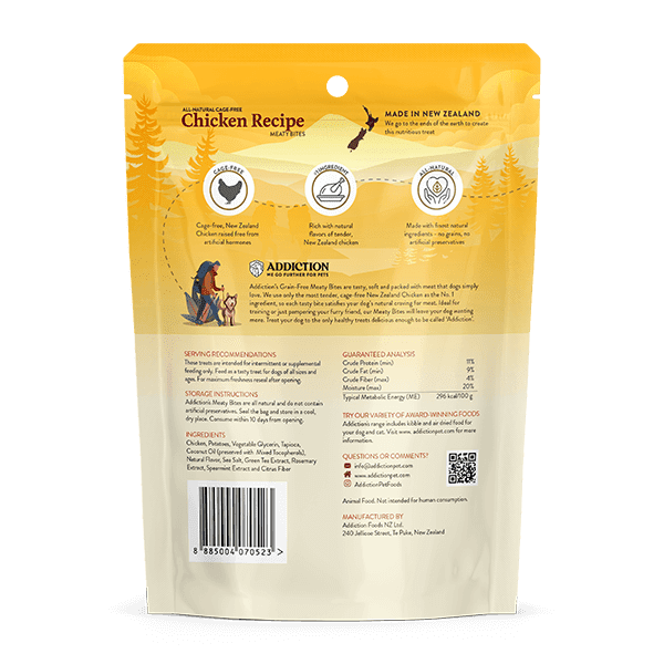Satisfy your dog’s natural meat craving with Addiction Meaty Bites Chicken Recipe. Made with cage-free New Zealand Chicken as the first ingredient, it’s moist and soft-textured and has a full, rich taste that dogs love. Designed to entice even the pickiest of canines, it’s ideal for complex training or as a reward. Treat your dog to the only healthy treat delicious enough to be called ‘Addiction’.