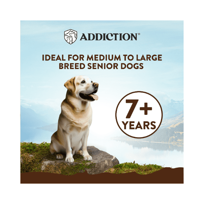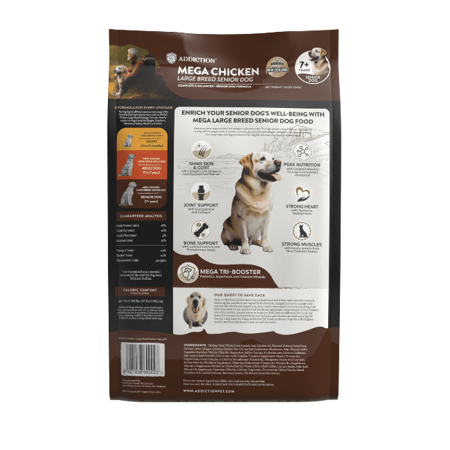Big dogs have different needs at every stage of life. Help your senior dog live life to the fullest with MEGA Chicken Large Breed Senior Dog Food, ideal for medium to large breed dogs ages 7+ years old. This premium, complete and balanced lifestage dog food, designed by animal nutritionists keeps your senior dog enriched and energetic with the proper levels of protein, minerals, glucosamine, and collagen. With Addiction Chicken Large Breed Senior Food, your senior dog can continue to live their big life!
