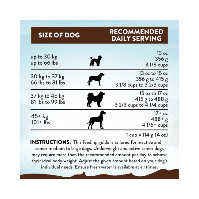 This feeding guide is tailored for inactive and senior medium to large dogs. Underweight and active senior dogs may require more than the recommended amount per day to achieve their ideal body weight. Adjust the given amount based on your dog’s individual needs. Ensure fresh water is available at all times.