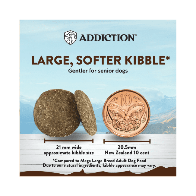 - Large, Softer Kibble: Gentle on senior dog teeth with a suitable texture and size at approximately 21mm wide (compared to MEGA Chicken Large Breed Adult Dog Food).