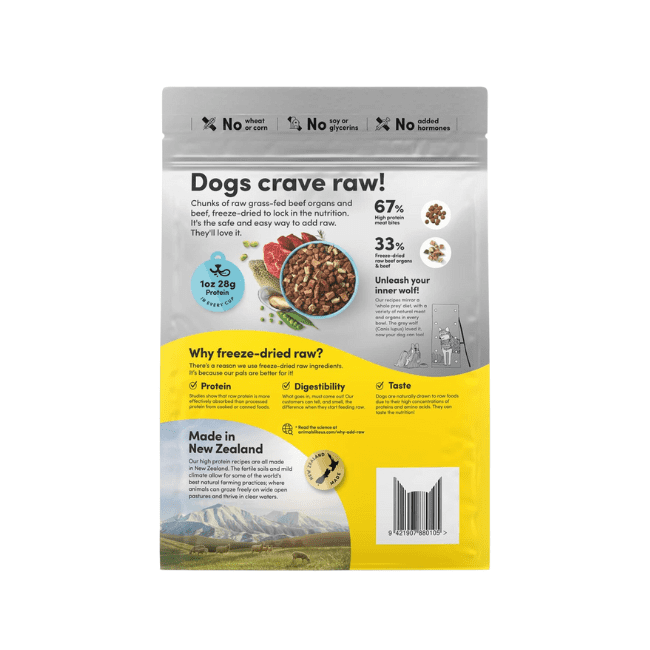 A tasty blend of 33% freeze-dried raw beef organs and beef, combined with 67% high protein meat bites. A safe and easy way to add the natural goodness of raw.