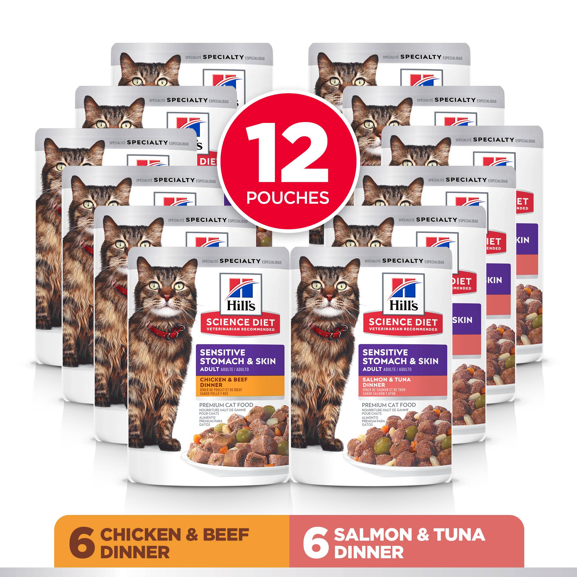 Elevate your cat’s mealtime with Hill’s Science Diet Adult Sensitive Stomach & Skin wet cat food pouches. Mealtime will never be boring again with these flavours that will satisfy your cat’s curious instinct. With chicken & beef, salmon & tuna flavours these convenient pouches serve up tasty chunks in a delicious gravy, supporting digestive health, nourishing skin, and promoting a lustrous fur. Use them as a standalone meal or kibble topper for balanced nutrition. Perfect for healthy adult cats with sensitive stomachs and skin. Give your kitty the tasty and nutritious meal they deserve!