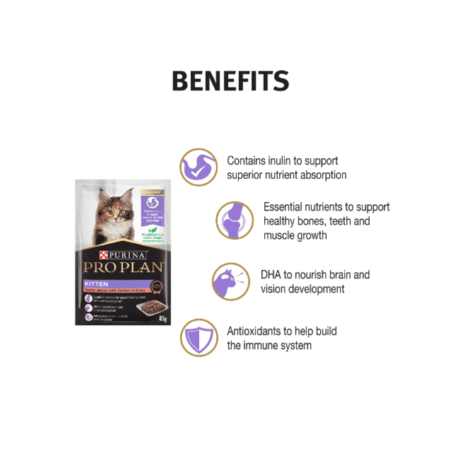 Pro Plan Kitten wet cat food is scientifically formulated to be 100% complete and balanced, containing all of the essential nutrients to support your kittens healthy bones, teeth and muscle gowth. Pro Plan Kitten contains DHA to nourish the brain and vision development as well as antixoidant to help build the immune system enabling your kitten the best start at life. It is made with real Salmon in a gravy Jelly for a delicious flavour your Kitten will love.