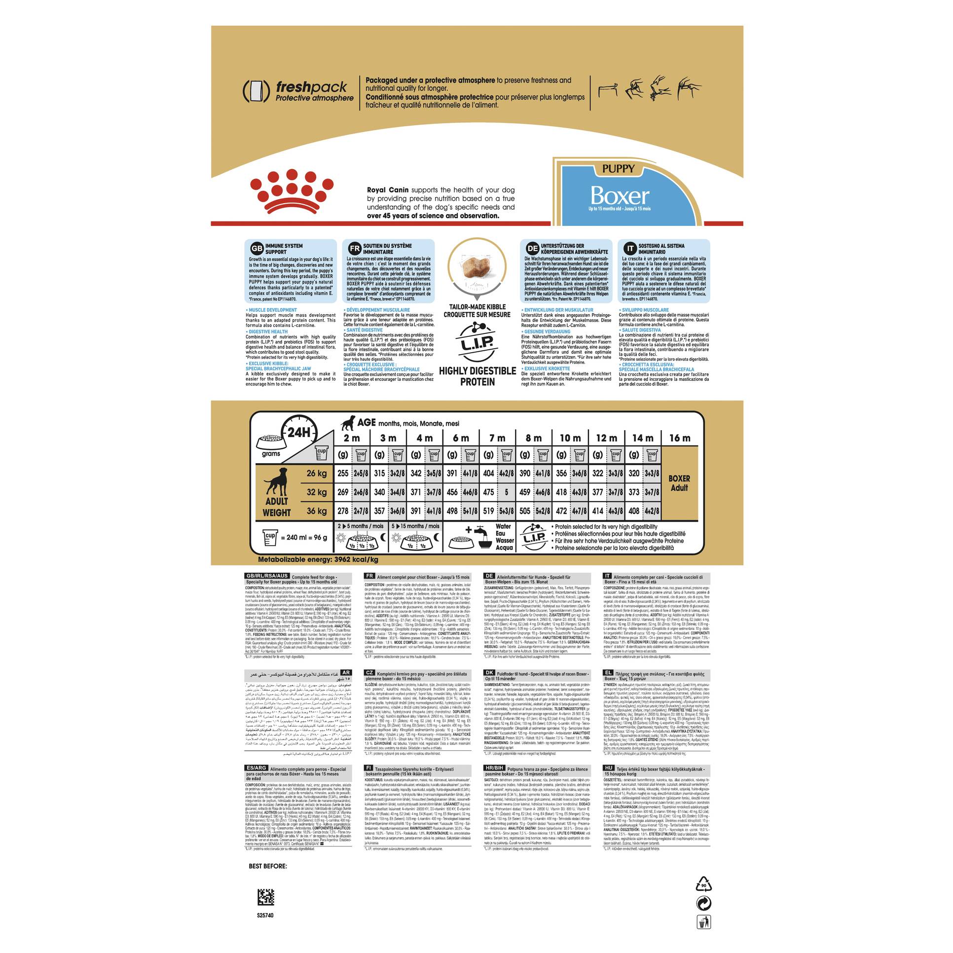 For your Boxer puppy, growth is an important stage. That’s why it’s essential to feed your puppy nutrients that help to support optimal health. Suitable for puppies up to 15 months old, ROYAL CANIN® Boxer Puppy is specially formulated with all the nutritional needs of your young Boxer in mind. ROYAL CANIN® Boxer Puppy contains a complex of antioxidants – including vitamin E – that help to support your puppy’s natural defences as it grows. ROYAL CANIN® Boxer Puppy contains a combination of nutrients with high quality protein that helps to support good digestive health and a healthy balance of intestinal flora. What’s more, the kibble in ROYAL CANIN® Boxer Puppy is tailor-made. The Boxer breed has particularly short and narrow jaws and can struggle to successfully pick up its food and chew it. That’s why this kibble is exclusively designed and adapted to the shape of your puppy’s jaws, to make it easier for it to grasp and to encourage chewing before swallowing.