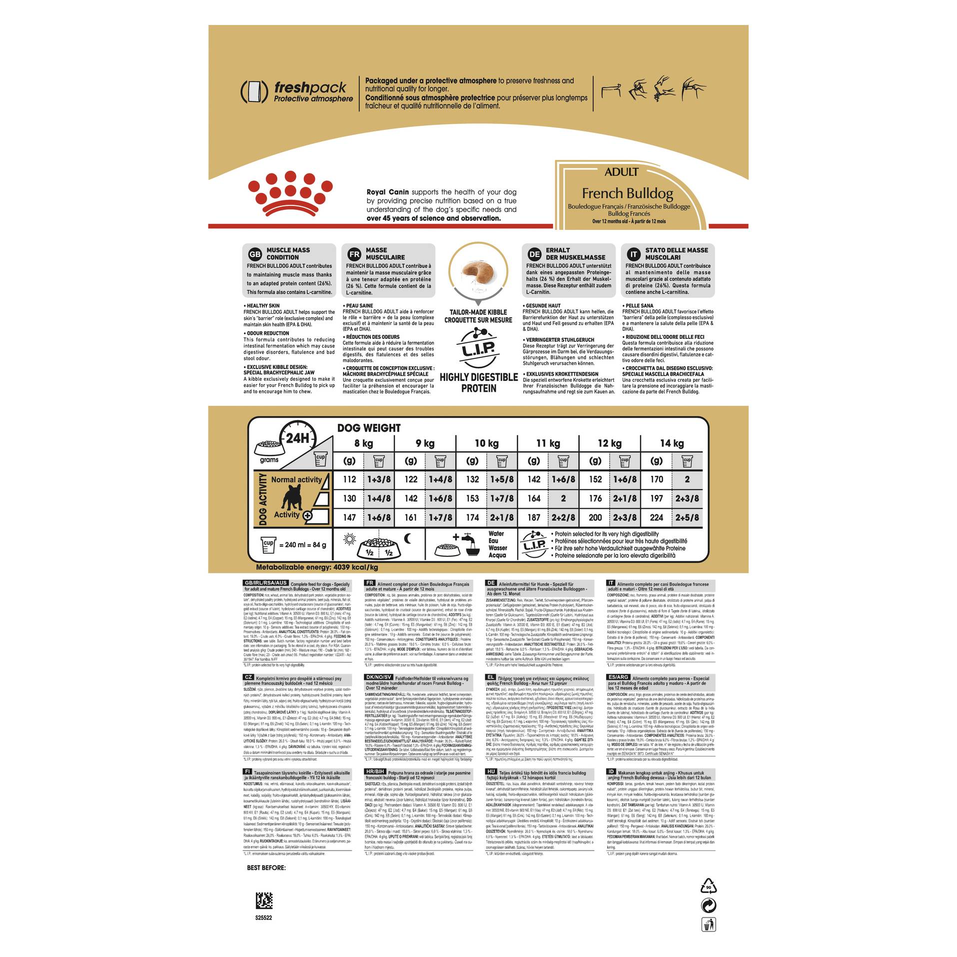 The French Bulldog is a small-sized breed with a lot of muscle, a compact structure and solid bones. These powerful dogs are typically alert, active, and intelligent.Suitable for French Bulldogs over 12 months old, ROYAL CANIN® French Bulldog Adult is specially formulated with all the nutritional needs of your adult dog in mind.To maintain its powerful muscles, the French Bulldog needs regular exercise. Shorter daily walks are better for bone and joint support than too much running or jumping.Nutrition is also essential for effectively maintaining muscle mass, that’s why ROYAL CANIN® French Bulldog Adult contains L-Carnitine and an optimal protein content.ROYAL CANIN® French Bulldog Adult also contains specific nutrients, including a specific complex and EPA and DHA, to help maintain the health of your French Bulldog’s skin and distinctive coat.What’s more, ROYAL CANIN® French Bulldog Adult contributes to maintaining optimal digestive health by helping to support a good balance of intestinal flora. This ultimately helps to reduce excessive flatulence and lessens the smell of its stool.