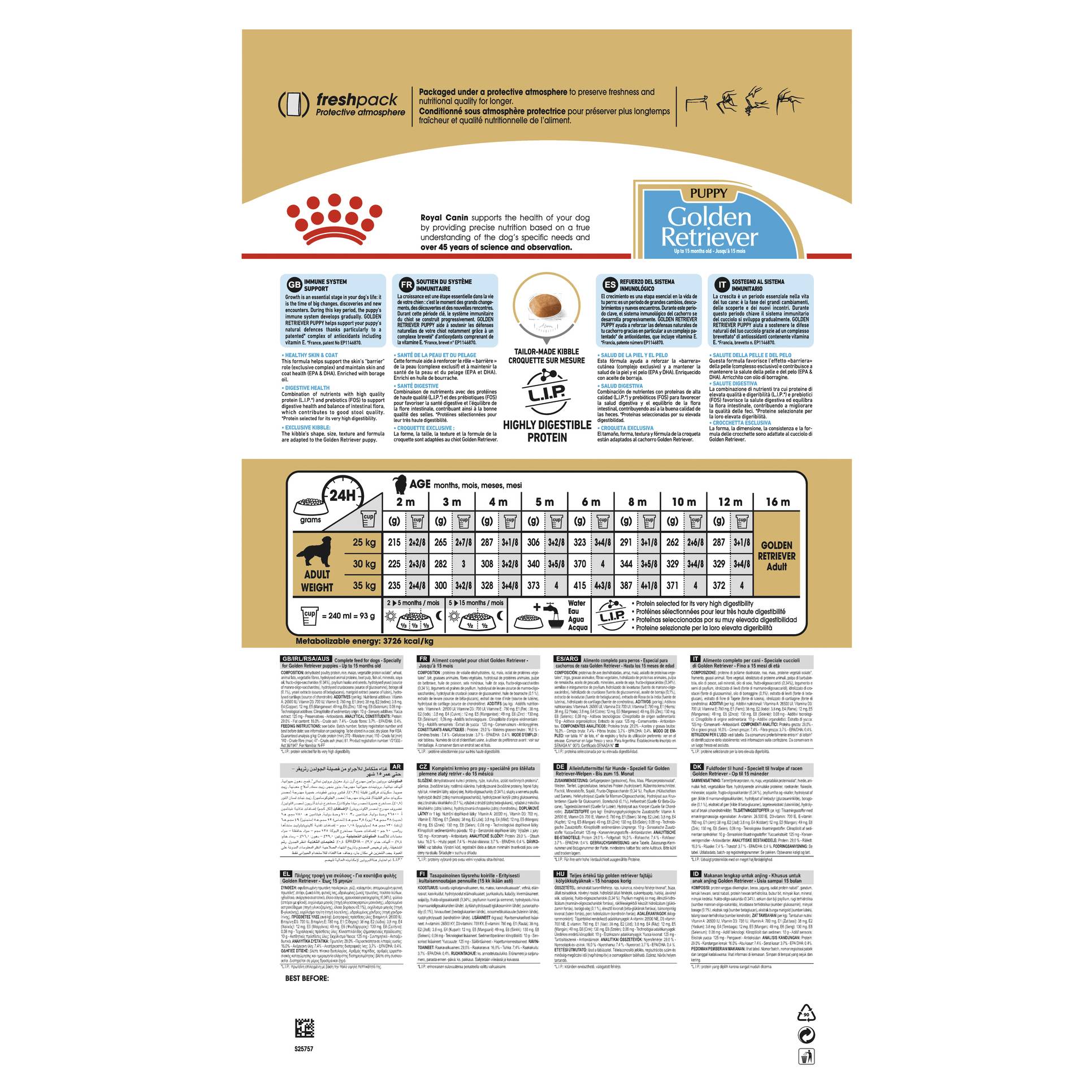 The kibble’s shape, size, texture and formula are adapted to the Golden Retriever puppy.