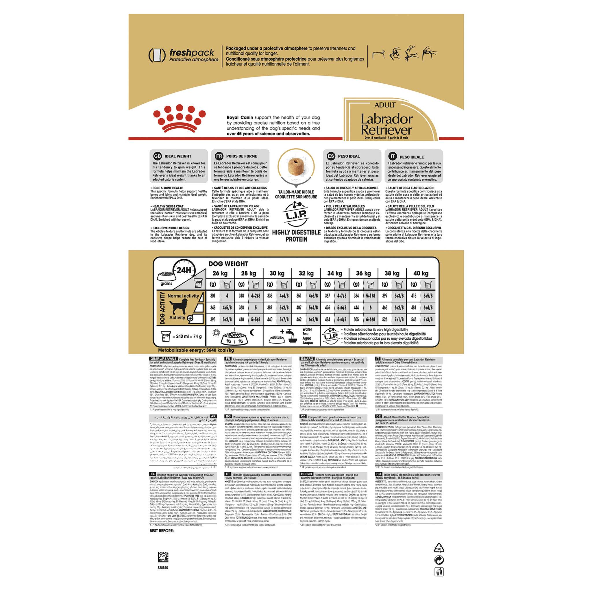 Suitable for Labrador Retrievers aged 15 months old and over, ROYAL CANIN® Labrador Retriever Adult is specially formulated with all the nutritional needs of your adult dog in mind. ROYAL CANIN® Labrador Retriever Adult contains an adapted calorie content – including an increased protein level and a reduced fat intake to help your dog maintain a healthy weight.The structure of a Labrador Retriever’s water-resistant coat insulates it from the cold. Therefore, the condition of a Labrador Retriever’s coat is essential.ROYAL CANIN® Labrador Retriever Adult helps to support the skin’s “barrier” role with an exclusive complex. With borage oil and other essential fatty acids among the nutrients included, this formula helps to maintain the health of your dog’s skin and coat.A determined athlete, the Labrador Retriever gives all it’s got when it comes to exercise. Its solid body and strong bones means that your dog needs nutrients that help to maintain its healthy joints.Through the inclusion of specific nutrients, including omega-3 fatty acids EPA & DHA, ROYAL CANIN® Labrador Retriever Adult helps support to healthy bones and joints. What’s more, the kibble’s texture and formula are tailor-made exclusively for the Labrador Retriever’s jaw. The specially adapted shape of the kibble also helps reduce the rate of food intake to help your dog maintain a healthy bodyweight.