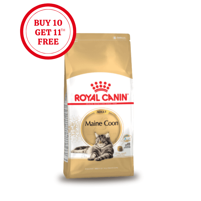ROYAL CANIN® Maine Coon Adult food is specially formulated with the needs of this particular breed in mind. You can rest assured that catering to your Maine Coon’s nutritional requirements is just as important to us as it is to you. The Maine Coon is the largest domesticated cat in the world, and its impressive stature is combined with a truly sweet nature. Its solid bone structure and muscular body can make it three times heavier than the average cat. Due to its large size and bone structure, particular attention must be given to ensuring the general health and condition of its joints. ROYAL CANIN® Maine Coon Adult food is enriched with Taurine, DHA and EPA (omega-3 fatty acids) to help support and maintain healthy cardiac function.The Maine Coon has a large jaw which gives it a characteristic way of picking and chewing its food. That’s why the kibble in ROYAL CANIN® Maine Coon Adult food is specially designed to be king sized and cube-shaped – prolonging the action of chewing which helps to support good oral hygiene. To cater to each cat’s individual preferences, ROYAL CANIN® Maine Coon Adult is also available as wet food in delicious gravy. If you’re considering mixed feeding, simply follow our feeding guidelines to ensure your cat gets an accurate amount of both wet and dry food for optimal benefit.