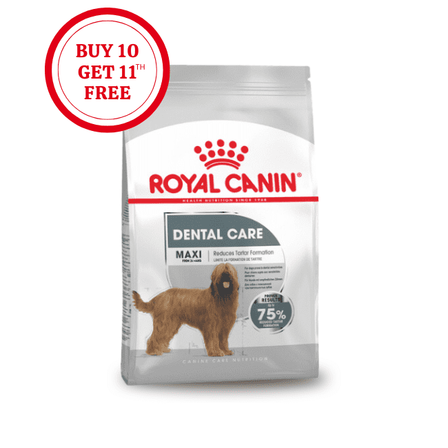 Your dog will only ever have one set of teeth, which is why it’s so important to help keep his teeth and gums healthy. Suitable for dogs that weigh between 26kg and 44kg, ROYAL CANIN® Dental Care Maxi boasts delicious-tasting complete nutrition that helps to support your dog’s dental health. This advanced formula features a smart kibble texture that actually cleans your dog’s teeth while chewing. The mechanical texture of the kibble surrounds each tooth as your dog bites down so that every mouthful rubs against the tooth’s surface, like a brushing effect. Over time, the bacteria that settles on your dog’s teeth after meals forms plaque, which mineralizes with calcium to cause tartar. This nutritious kibble is enhanced with chelators that bind to calcium in your dog’s mouth, which helps to stop the formation and build-up of tartar. Our Digestive Care nutritional program has two components available: crunchy kibble and a delicious pâté in a pouch, both are nutritionally complete and perfectly complement each other. Why not try the pâté as a delicious topping to the kibble? Don’t just take our word for it, ROYAL CANIN® Dental Care Maxi is scientifically tested and proven to reduce tartar formation by up to 75%. This means that ROYAL CANIN® Dental Care Maxi’s results are a proven success.