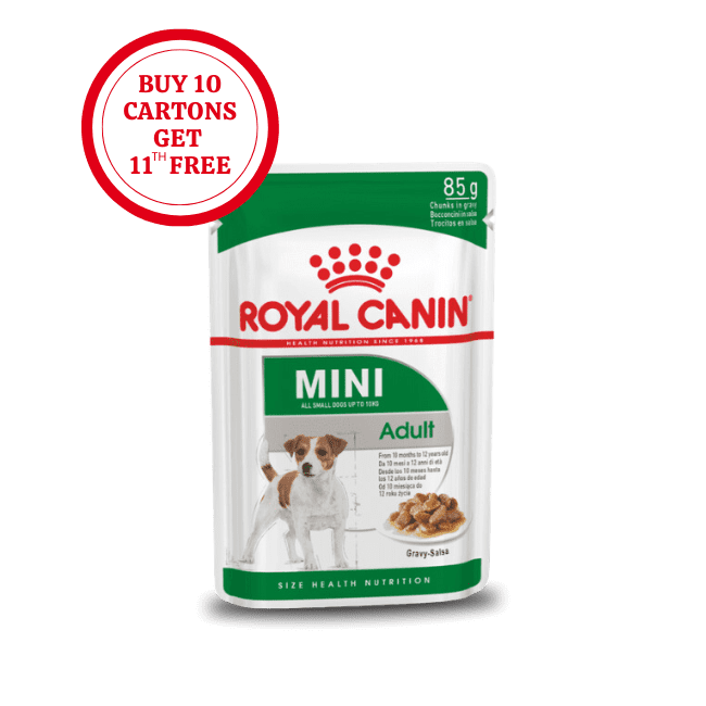 ROYAL CANIN® Mini Adult in Gravy is specially formulated with all the nutritional needs of your mini adult dog in mind. ROYAL CANIN® Mini Adult in Gravy is suitable for all small dogs aged between 10 months – 12 years that weigh up to 10kg. The formulation of specific nutrients in ROYAL CANIN® Mini Adult in Gravy helps to support your dog’s digestive health, as well as helping to maintain a good balance of intestinal flora. The carefully adapted energy content in ROYAL CANIN® Mini Adult in Gravy helps to maintain an ideal weight in small breed dogs like yours. What’s more, ROYAL CANIN® Mini Adult in Gravy is also enriched with nutrients that help to support your adult dog’s healthy skin and coat condition – such as Omega-3 fatty acids EPA and DHA. To cater to each dog’s individual preferences, ROYAL CANIN® Mini Adult is also available as dry food, with crunchy and tasty kibble. If you’re considering mixed feeding, simply follow our feeding guidelines to ensure your dog gets an accurate amount of both wet and dry food for optimal benefit.