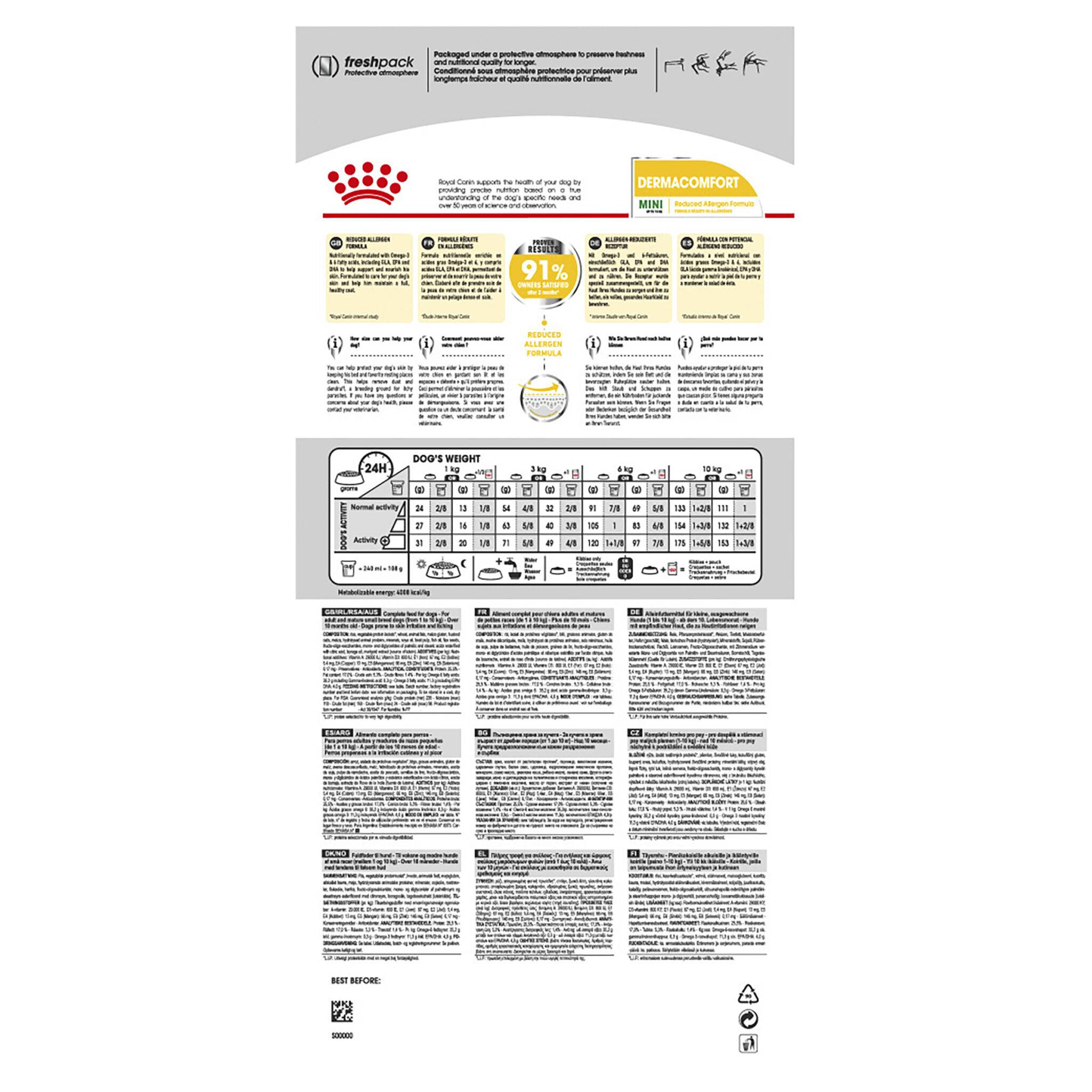 Irritated skin is no fun for anyone, including your dog. Did you know that skin irritation is the number one reason dogs are taken to the vet? Sensitive, itchy skin means a lot of scratching, and your dog can damage his skin with his claws – ultimately risking infection. ROYAL CANIN® Dermacomfort Mini’s reduced allergen formula is carefully prepared using a specifically selected range of proteins. This specially adapted nutrition helps keep your dog’s skin in the best possible condition. What’s more, it also helps to maintain your dog’s full and healthy coat. Suitable for dogs that weigh up to 10kg, ROYAL CANIN® Dermacomfort Mini contains carefully designed kibble that fits perfectly between your dog’s teeth. This extra-tasty recipe is specially crafted for your dog’s wellbeing. It contains Omega 3 and 6 fatty acids, including GLA, EPA and DHA, to help support and nourish skin, making it less sensitive to irritants in your dog’s environment. Our Dermacomfort nutritional program has two components available: crunchy kibble and a delicious pâté in a pouch, both are nutritionally complete and perfectly complement each other. Why not try the pâté as a delicious topping to the kibble? Don’t just take our word for it, 91% of owners were satisfied with this product after just 2 months of continued use. This means that ROYAL CANIN® Dermacomfort Mini’s results are a proven success.